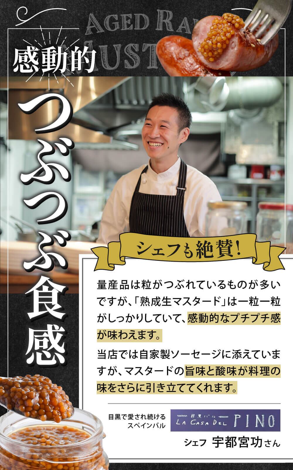 素材重視の本格派:カナダ産大粒イエローマスタードシードをたっぷり使用。天然はちみつと国産赤酢、本醸造醤油で漬け込み、1週間以上熟成させた旨味が特徴です。