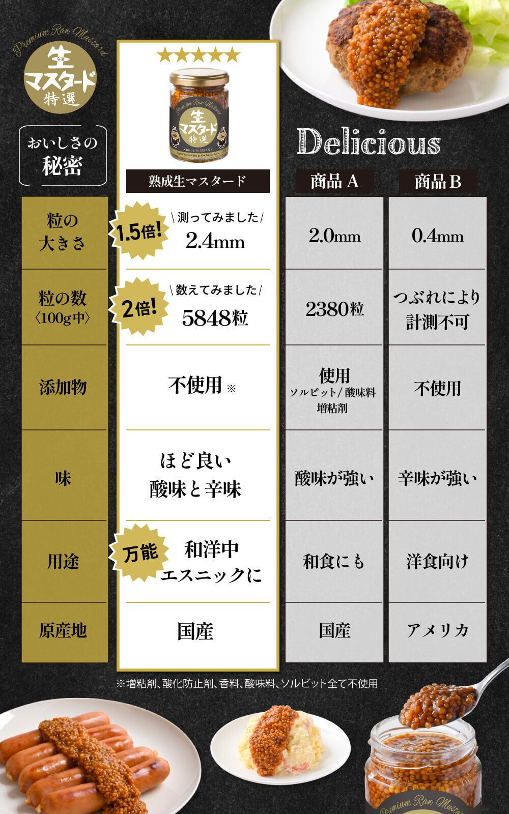 素材重視の本格派:特選生マスタードは、選りすぐりの大粒イエローマスタードシードを贅沢に使用し、風味豊かに仕上げています。芳醇な香りと深い味わいを実現するため、天然素材にこだわり、一つ一つ丁寧に製造しました。