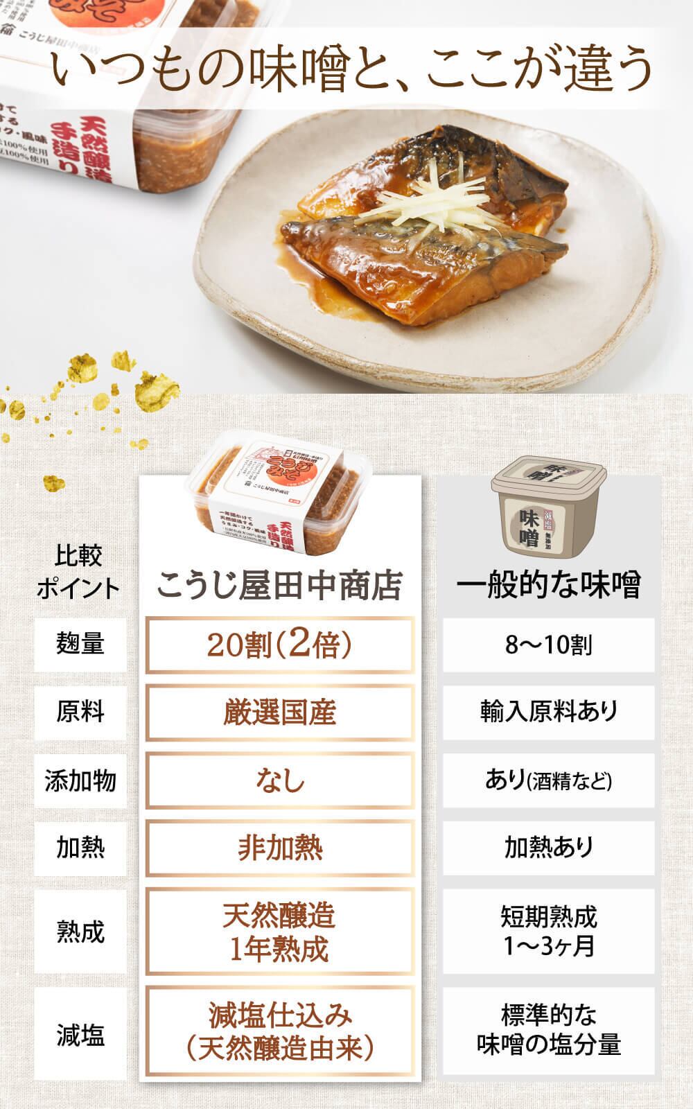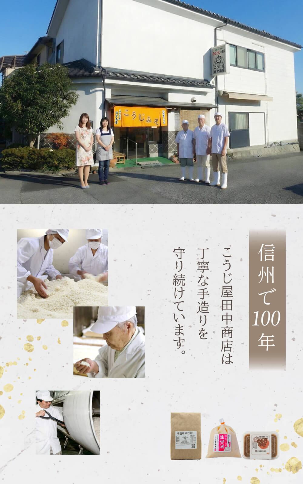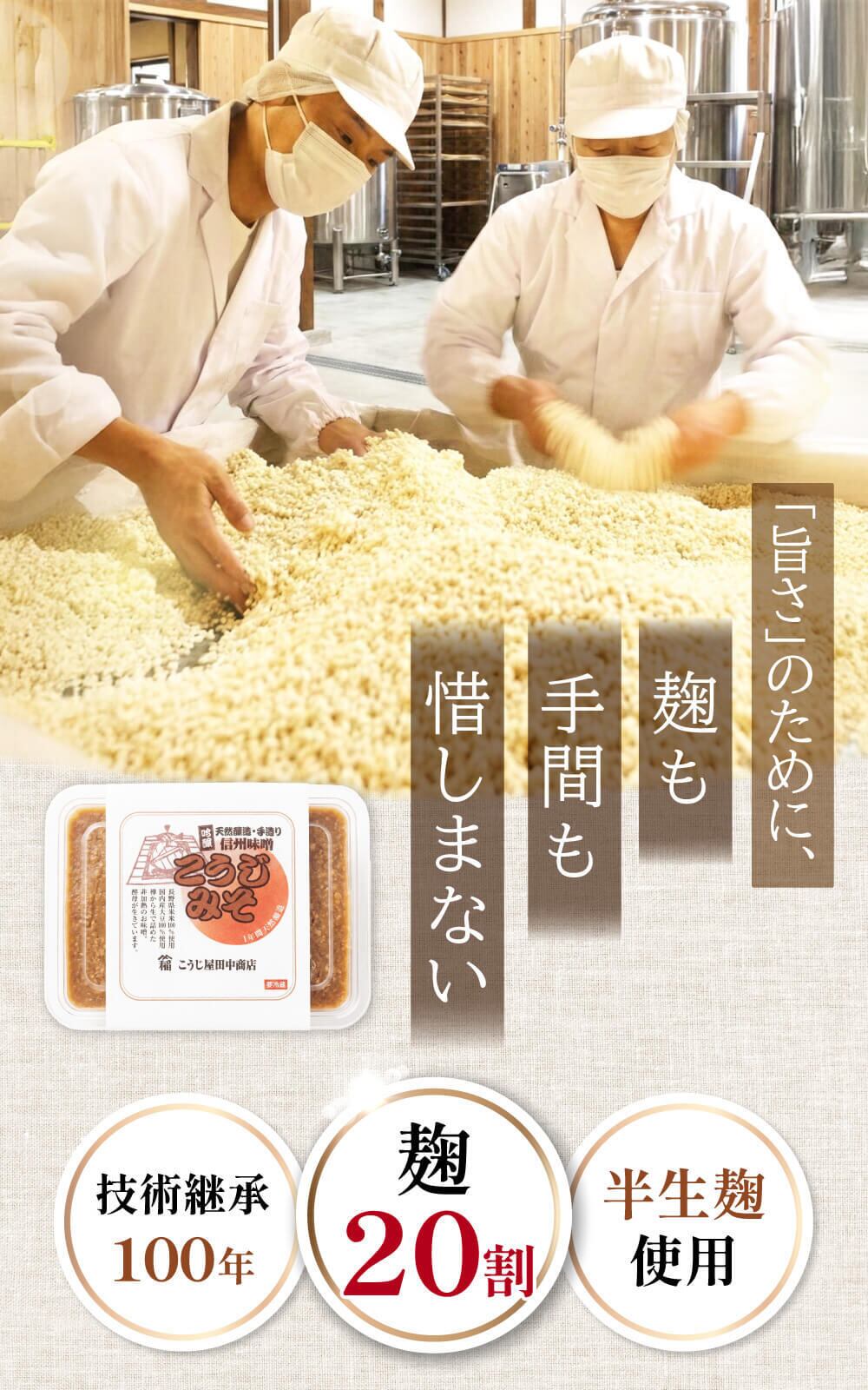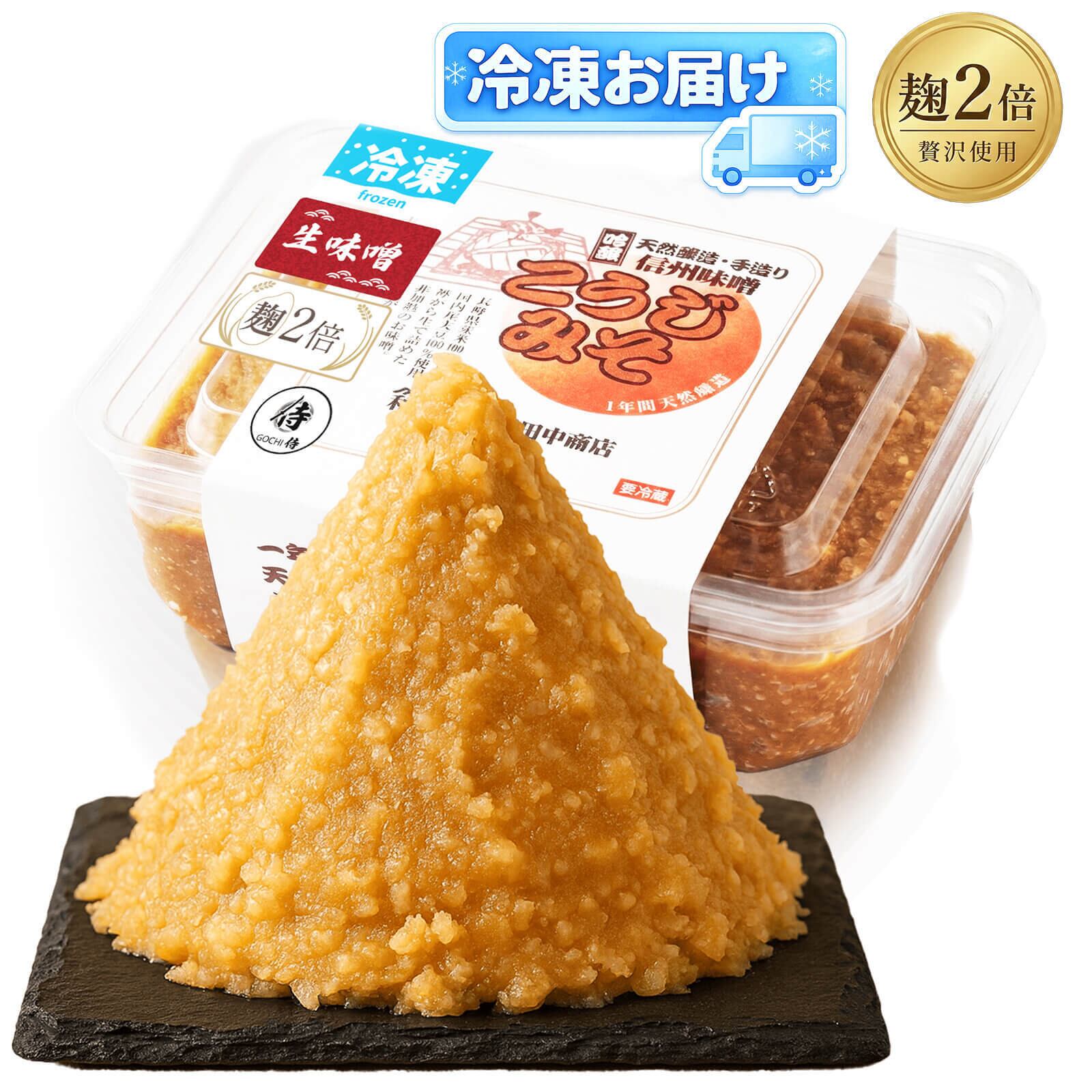信州のこうじ屋田中商店が仕込む、蔵出しの生味噌(非加熱)です。米こうじを20割(一般の約2倍)使い、こうじ由来の甘みとコクがしっかり感じられる、まろやかな味わいに仕上げました。