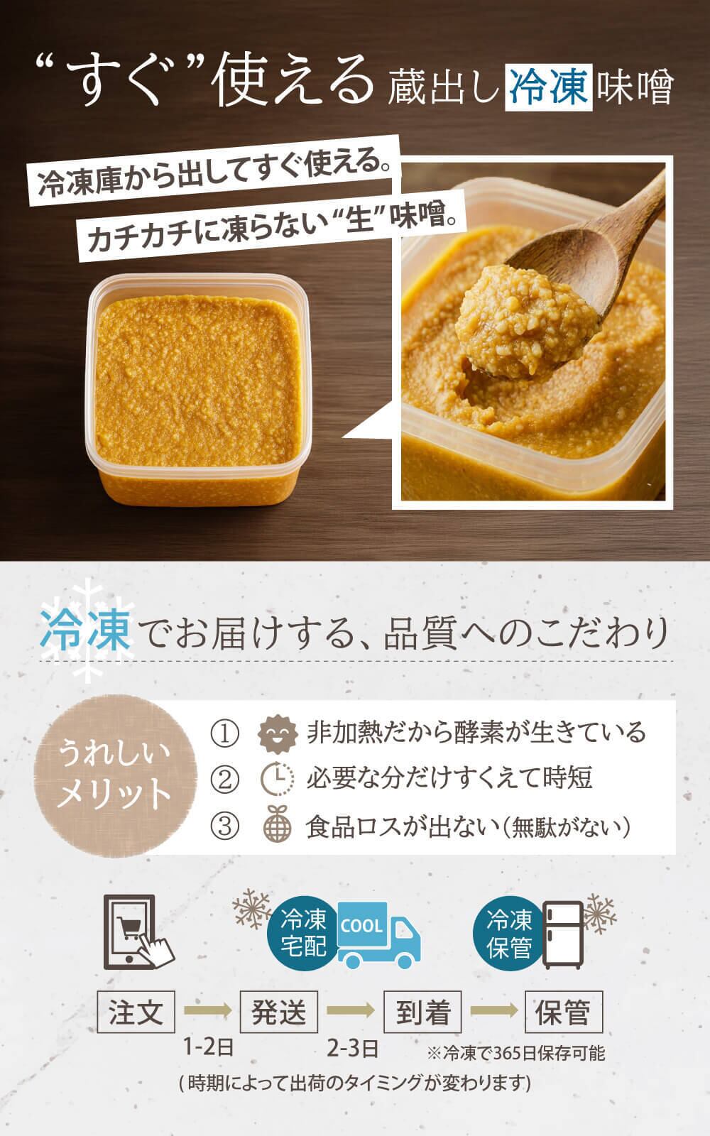 本品は冷凍便でお届けします。冷凍庫から出して必要な分だけすくって使えるので、毎日の味噌汁が手早く決まります(※硬く凍りにくい設計)。保存は冷凍なら365日保存が可能です。
