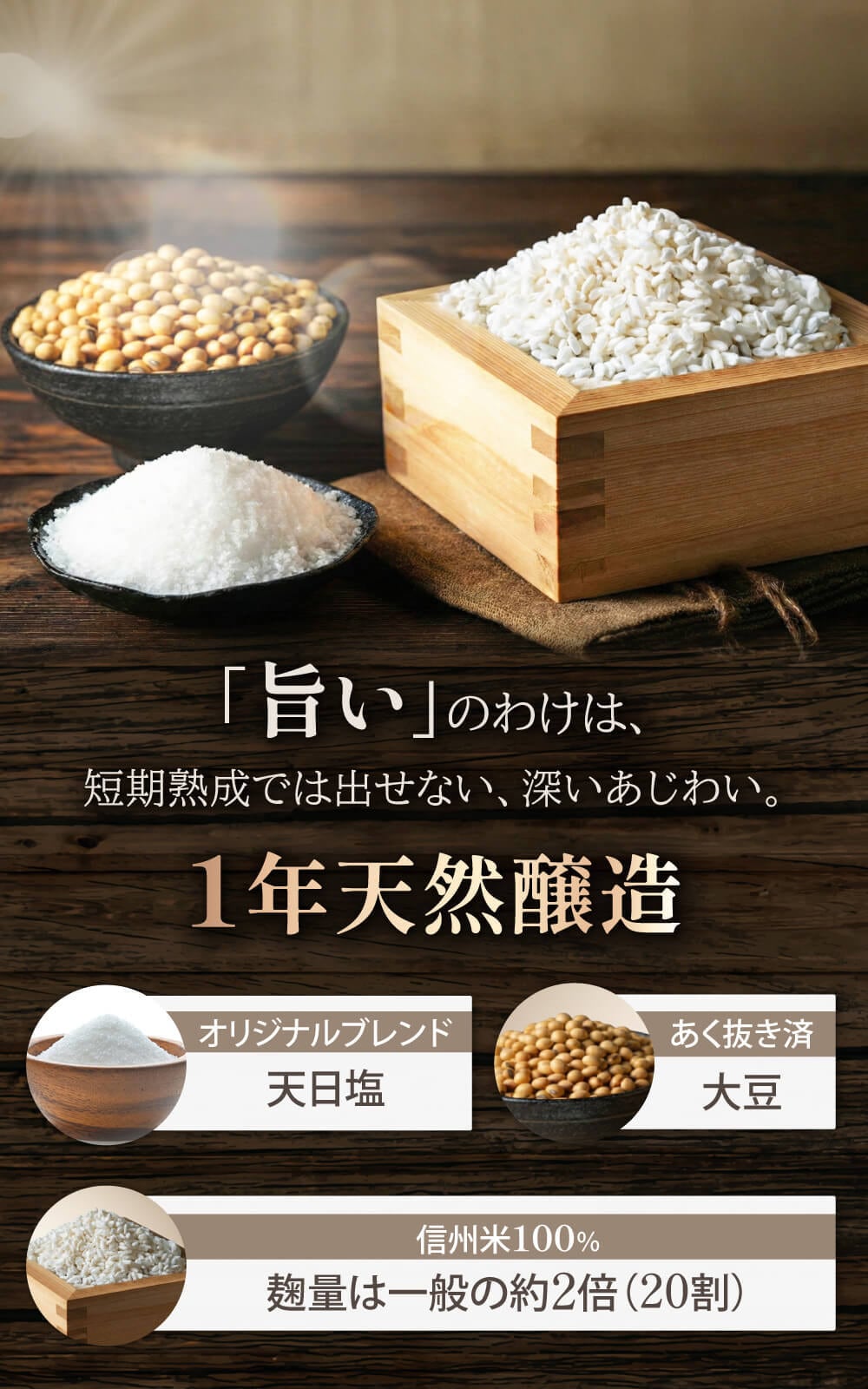 塩分は100gあたり8.6g相当(一般的な味噌の塩分を30%カット)。